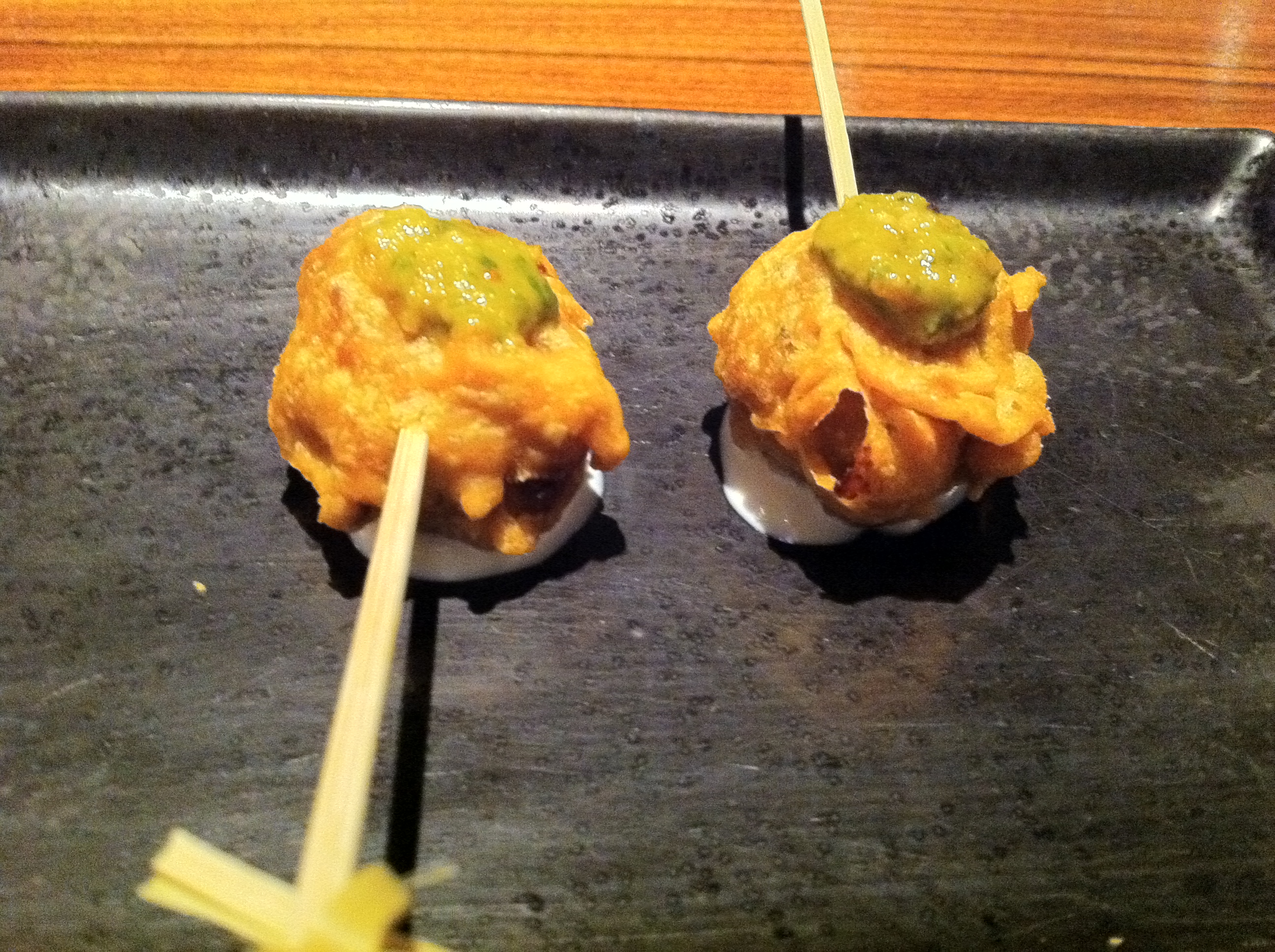 The amuse bouche was a potato fritter topped with some unidentifiable green mush – pleasing if unremarkable, tasting like a grease-free potato version of a bhaji.