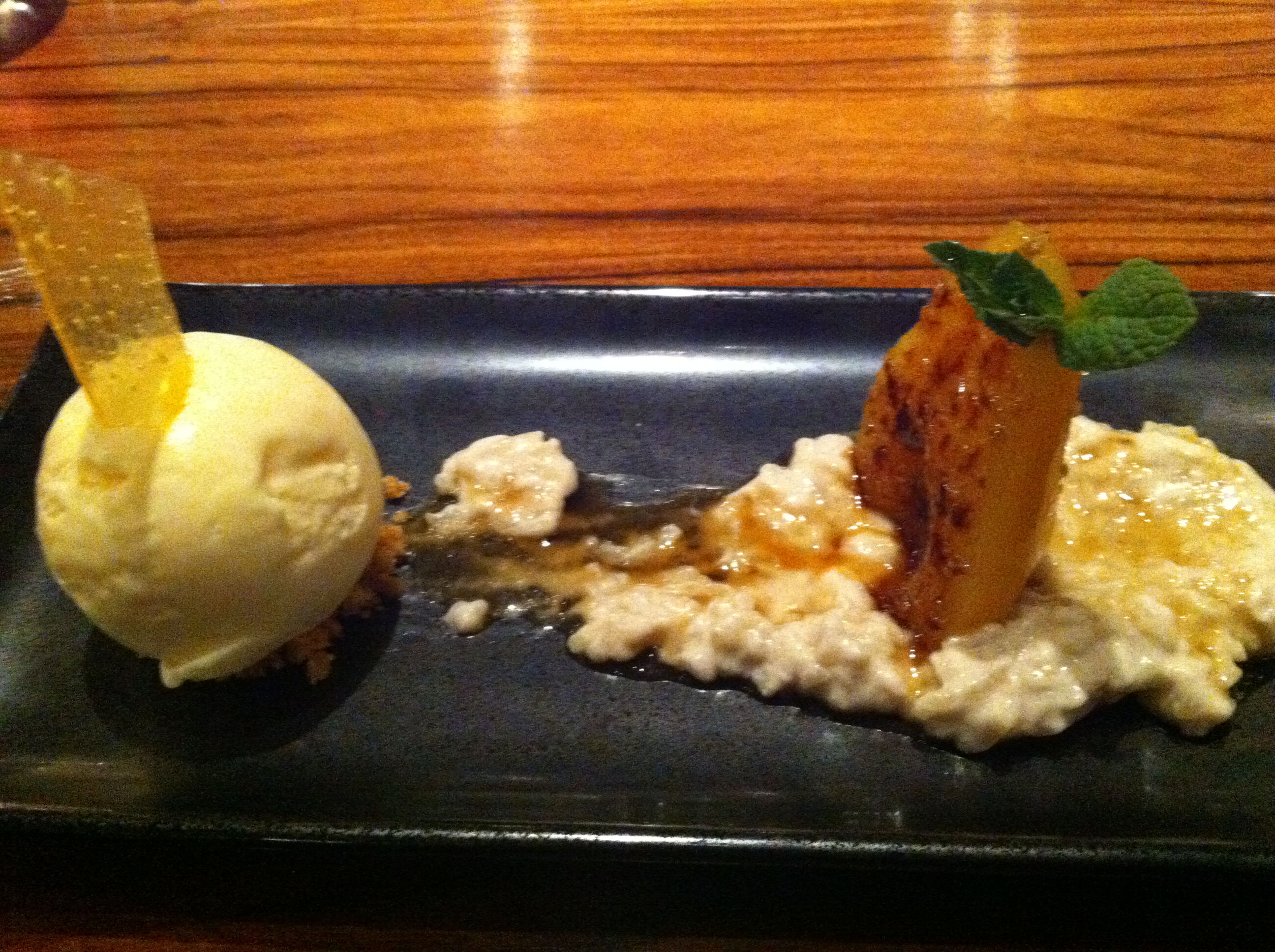 My dessert was an unusual combination of star anise-flavoured ice cream paired with a poached pear and payasam, a Keralan rice pudding. Poached pears are close to becoming a cliche in the world of posh restaurant desserts, but the sugary sweetness was offset well by the unmistakably distinctive taste of the star anise ice cream and the creamy payasam. The payasam wasn’t quite as satisfying since it was served uncharacteristically cold.