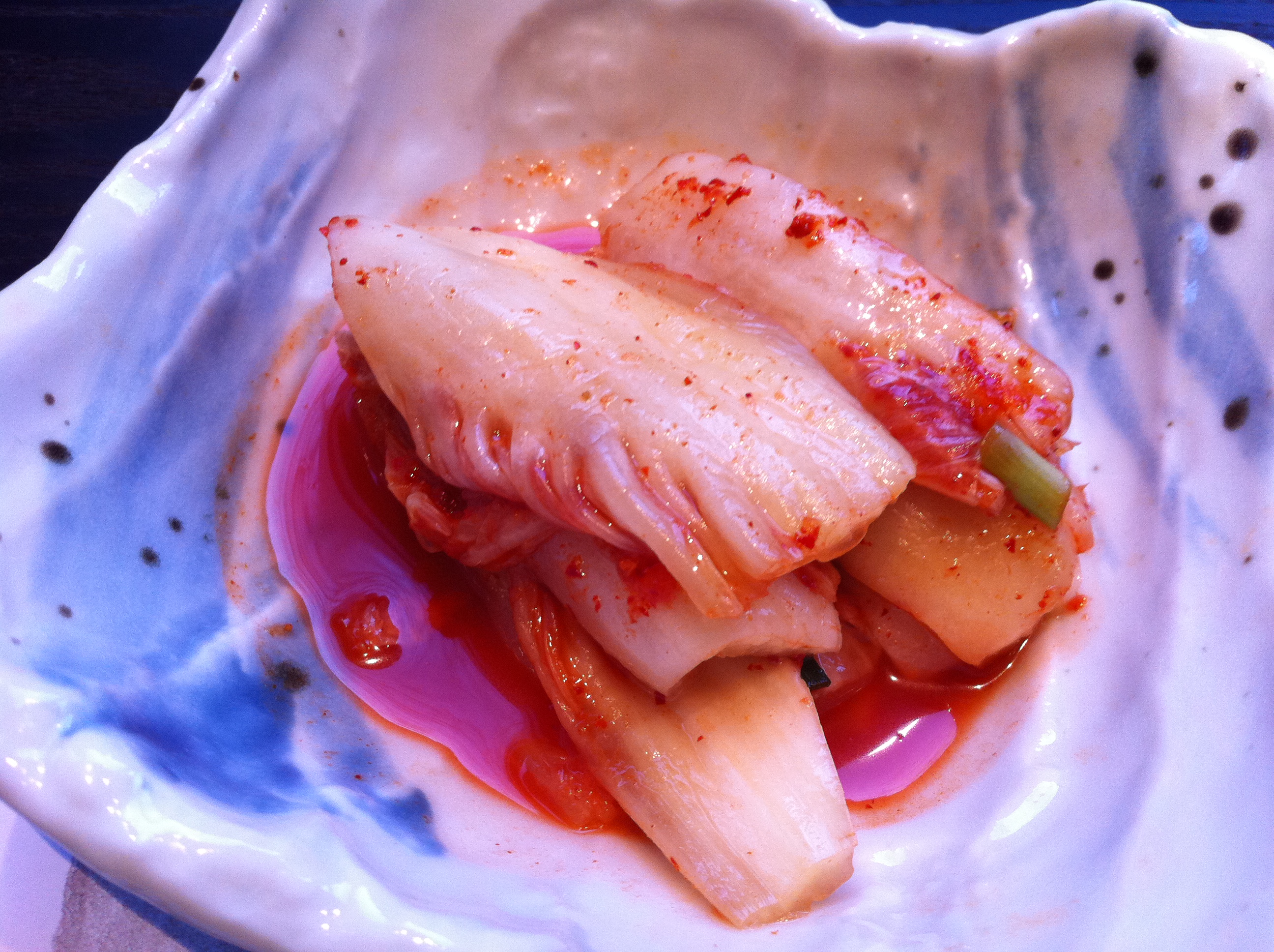 The food is traditionally Korean with almost no contemporary twists that I could discern. Perhaps one of the most important dishes is the Korean staple kimchee – spicy fermented cabbage that doesn’t appeal to everyone but I love it. The kimchee here isn’t as immediately, overpoweringly spicy as other examples of the dish that I have had, but has a cumulative spiciness that sneaks up on you. In a way, the lack of a piquant punch is a good thing, as I found the sour tartness of the preserved vegetables surprisingly refreshing on the unseasonably warm April evening of my visit.