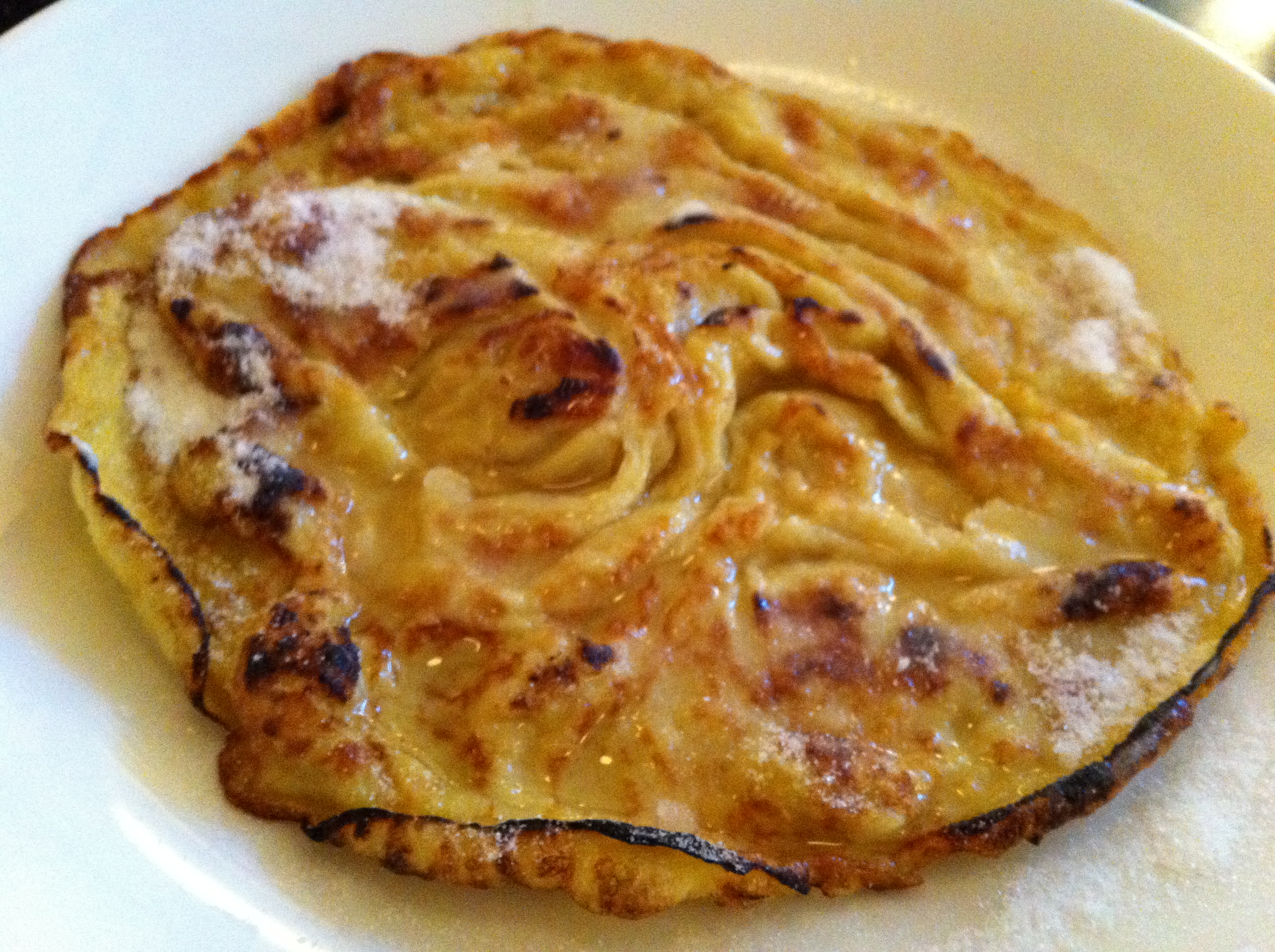 An omelette is a rather unusual dessert menu item in the English-speaking world, so naturally I had to have it. Here, the omelette has been cooked with a liberal helping of calvados, a French apple-flavoured brandy, a touch of vanilla and then dusted with some sugar. Despite being wafer thin, it’s surprisingly fluffy. The flavour can be oddly tart and subtly sweet depending on the mouthful, no doubt due in part to some of the calvados which naturally also gives the dish a very boozy character. A large hit of alcohol can sneak up on you in the next mouthful when you least expect it. I’m glad I tried it, but I probably wouldn’t order it again.