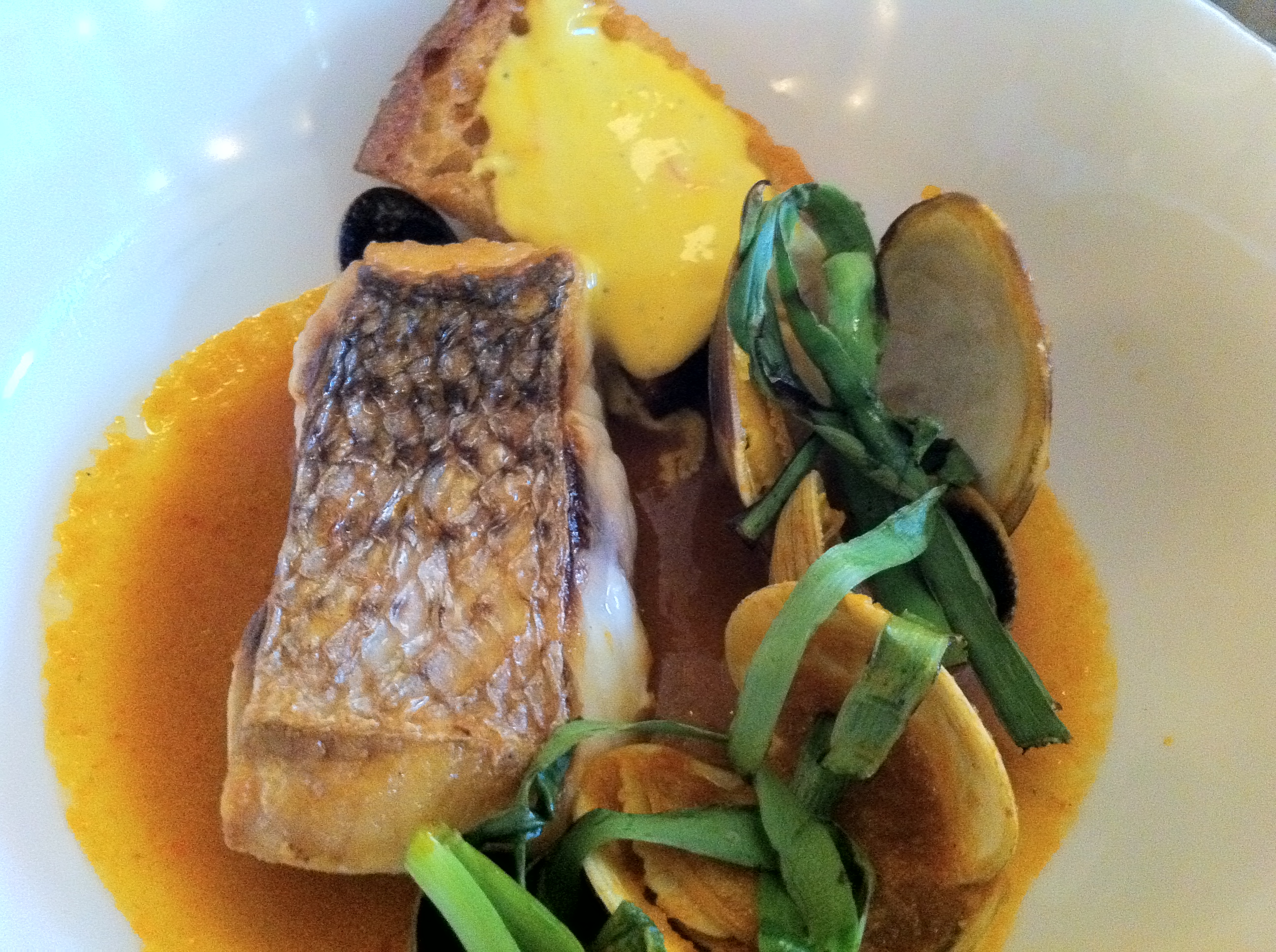 My main course of striped sea bass was a success, especially in contrast to the branzini at Balthazar. The firm yet flaky fish was well grilled with crispy skin. While it lacked the strongly chargrilled taste of the branzini at Balthazar, this was more than made up for by the well-chosen accompaniments which Balthazar’s dish lacked. The gently spiced tomato sauce perked up the fish and also went well with the bitingly fresh clams, although some of the clams weren’t quite as big as I would’ve liked. A side dish of shredded leeks doused in a refreshingly tart vinaigrette provided the necessary vegetable component.