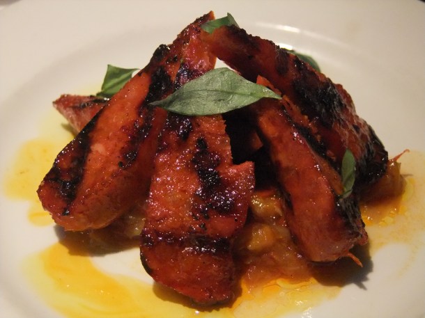 I couldn’t come to The Salt Yard without ordering the signature dish that impressed me so much the first time I ate there – courgette flowers stuffed with goats cheese and drizzled with honey. I was fully prepared to be satisfied and slightly underwhelmed just as I had been by The Opera Tavern’s version of the dish, but I needn’t have been so pessimistic. The delicately crisp batter gave way to a firm vegetable bursting with intensely stinky cheese that somehow blended well with the delicately sweet honey. Order two and keep them all to yourself.