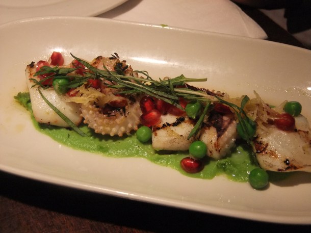 The Squelchie doesn’t like nomming on cuttlefish (they’re cute apparently), but I have no such qualms. The chargrilled little bugger has a firm bite with soft, tender interior. As expected it has little flavour of its own, acting as a tender carrier for the pea, pomegranate and mint dressing, although the disparate ingredients of the dressing never really come together as a whole. An interesting failure.