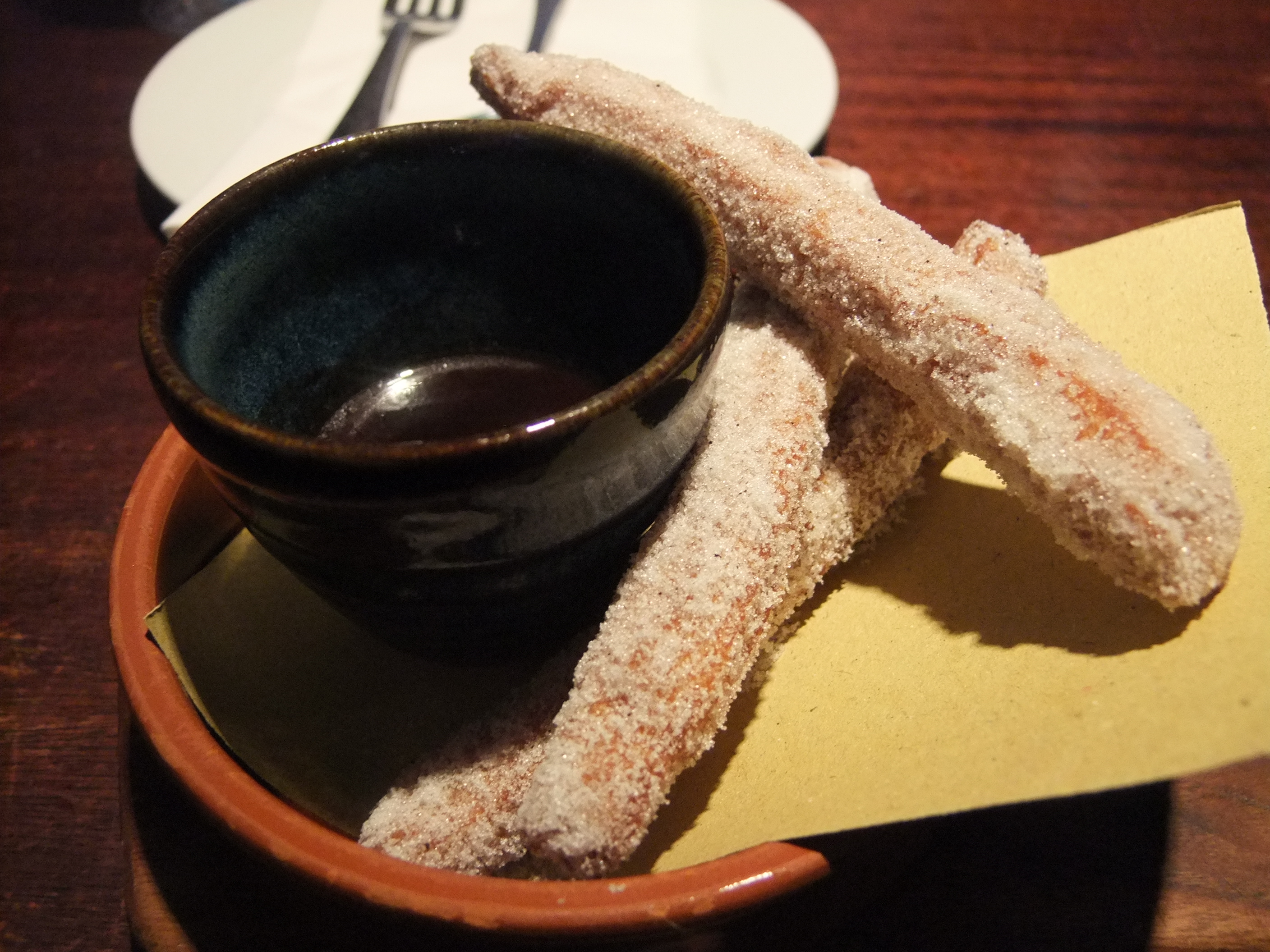 January and the Squelchie skipped dessert, but I couldn’t resist trying out The Salt Yard’s version of churros, deep fried dough sticks served with dipping chocolate that’s popular both in Spain and Mexico. The churros here are thankfully oil-free, but the dense, smooth exterior doesn’t absorb or hold the dipping chocolate very well and is also blanketed in an excess of sugar. The dipping chocolate, which uses Valrhona chocolate as its base, is much more of a success. It’s dark, rich and has a bitter spiciness to it.
