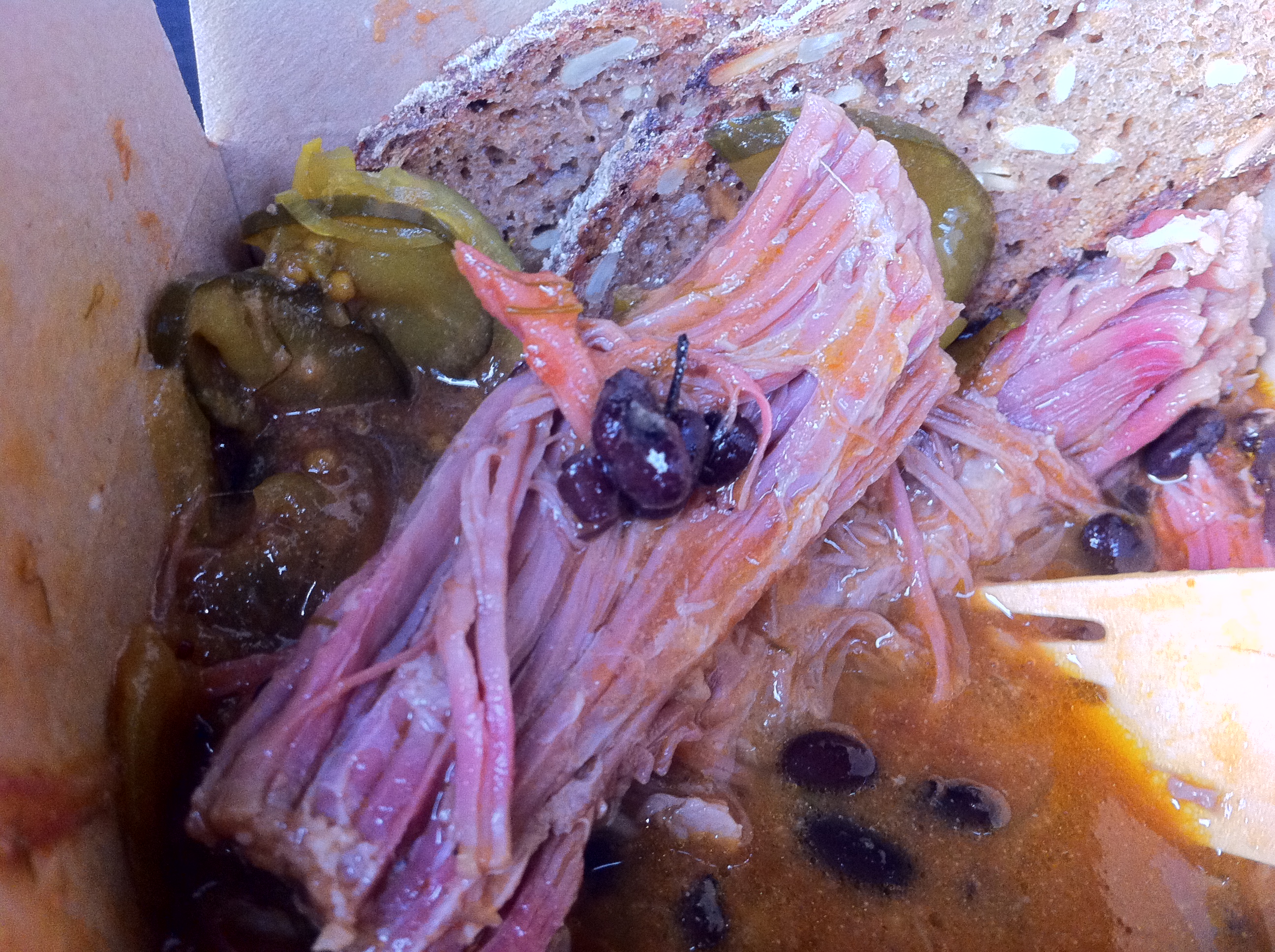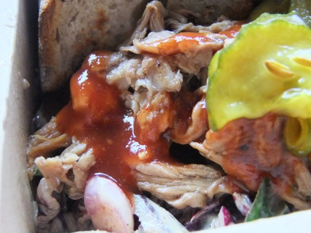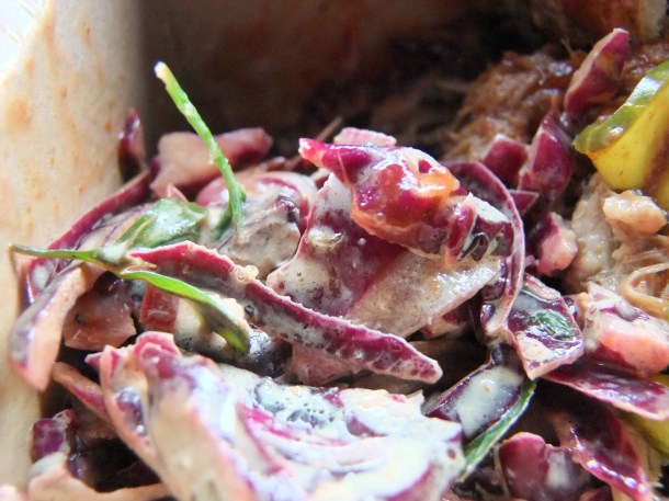 Once again the side dish was in some ways more interesting than the meat. The red cabbage and parsley coleslaw wasn’t excessively creamy nor was it bland and soft – the parsley is unmistakable and the shreds of red cabbage have a firm bite which provides a nice counterpoint to the tender meat. The refreshingly zesty pickles were present and accounted for.