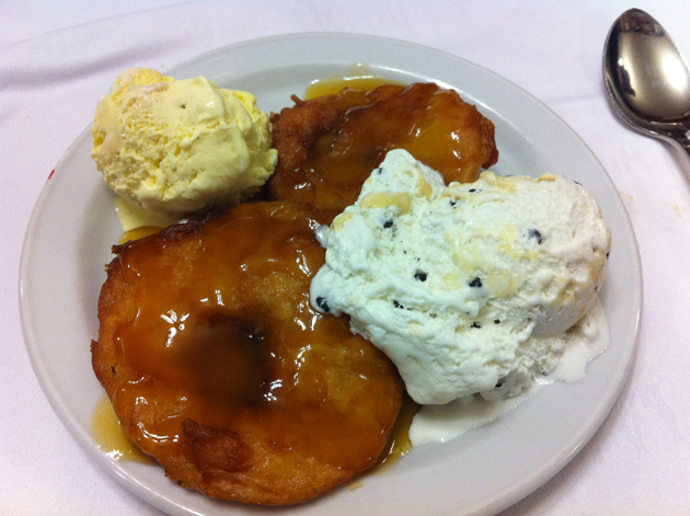 The dessert was less impressive. I opted for bunuelos, but the dish I was served at La Bola was completely unlike the Mexican version I had at Benito’s Hat back in London. Here two thick slices of apple had been deep fried in a thick buttery batter, covered in honey and then served with chocolate chip and vanilla ice creams. Sadly the batter was too thick and stodgy for my taste, the honey was utterly forgettable and the ice creams tasted as if they’d been bought from the bargain bin freezer at the supermarket. Disappointing.