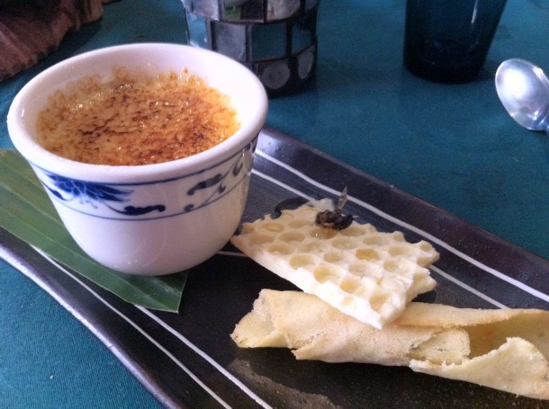 Sue-Ellen let out a squeal of dismay when she found out that I had a bee for dessert. I felt a little guilty about eating the bee after finding out about the trouble the world’s bee population is in, especially as the buzzy little fellow died in vain – he didn’t give me much gastronomic pleasure, with barely any taste of texture of his own. The bee at Archipelago was served on top of a piece of honeycomb alongside a buttery, wafter thin biscuit roll and a crème brulee which were altogether more successful.
