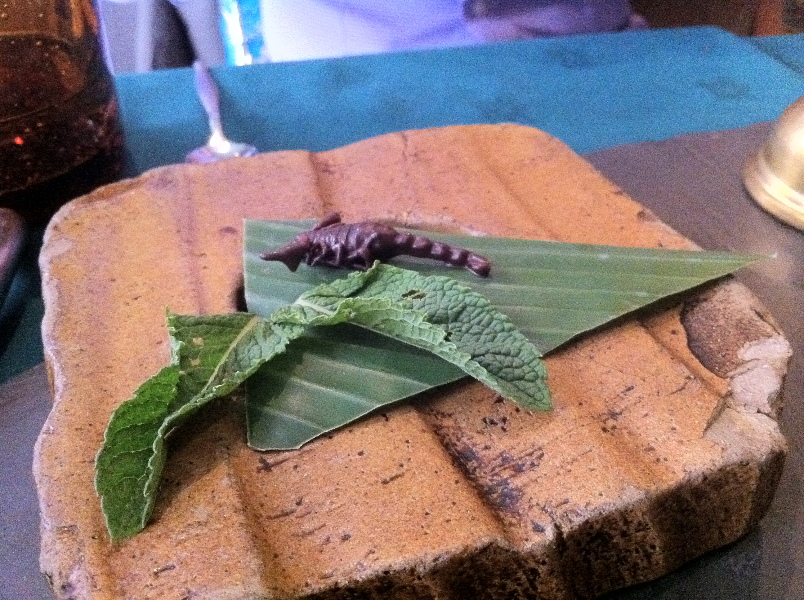 I couldn’t leave Archipelago without trying the chocolate-dipped scorpion, egged on as I was by my lunching compatriots. The waitress warned that it was imperative to chew the tail to prevent the stinger from doing any damage as it made its way down my throat, so I was expecting an anthropod of monster proportions.
