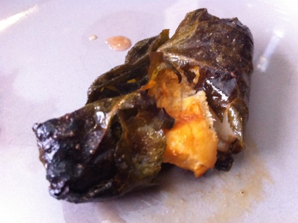 Since this was a business lunch we all decided to share our starters which allowed me to sample a nice swath of the menu before moving on to my main course. First up was crocodile wrapped up in vine leaves. The old cliché about crocodile tasting like chicken is still true, although in this case it tastes like particularly tough, leathery chicken wrapped in equally tough vine leaves. Although the meat had a citrusy flavour which made up for this to a certain extent, the leaves didn’t taste of much. Since this is the second time I’ve had crocodile, I’m starting to think that there’s a good reason this meat isn’t more widely available in Britain – it’s not worth eating (although I’m open to having my mind changed).