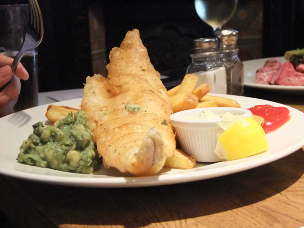 Mumbles is notoriously unimaginative when it comes to food and not terribly descriptive about it either, so it took some coaxing to get an opinion out of him about his beer battered haddock served with chips, mushy peas and tartare sauce. While the mushy peas and tartare sauce were fine, he thought the chips, while thankfully ungreasy, were too soft and not crisp enough. The fish may have been nicely cooked, but the batter was too stodgy and oily, even for his pudgy, beardy face.