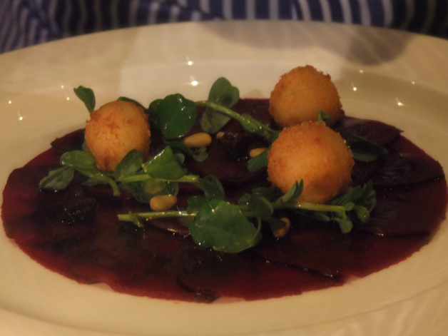 Baron Greenback wasn’t as satisfied with his starter of sliced beetroot served with balls of fried, breaded goats cheese. The raisin and pine nut dressing did little to disguise how unsuited the beetroot and goats cheese are as a pair. The entire dish felt a little thrown together.