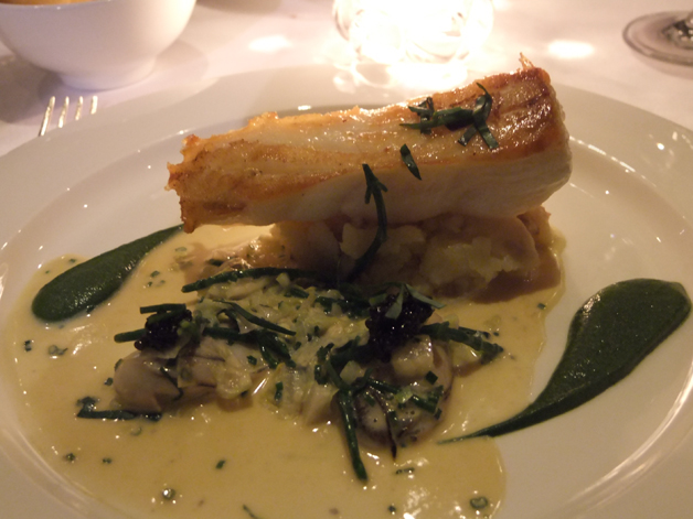 I continued my seafood theme by having turbot as my main course. The firm, meaty, juicy, well-cooked fish was accompanied by creamy mashed potato and some salty, creamed vegetables. The real highlights were the single, lone oyster, which was deliciously creamy, and a very small dollop of smooth, salty caviar. These two tiny accompaniments were the source of most of the flavour in this dish, so it’s a shame there wasn’t at least a little more of either of them.