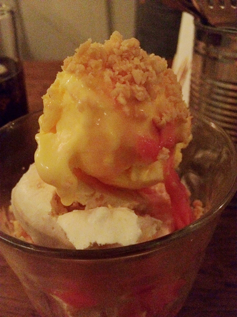 The rhubarb mess, on the other hand, came close to being an unqualified success. The quivering pink slivers of rhubarb have a lovely sharp and sour taste that’s not buried underneath a mass of cream, but instead sits in a gently sweet and fruity sauce. The chunks of meringue are crisp and break apart easily, providing a contrast in texture without getting in the way with excessive crunchiness. There may be problems with consistency though as on one subsequent occasion the rhubarb was a little too soft for my liking, but making up for it was the surprise addition of ginger in the bottom of the glass adding a nice spicy finish to the dessert.
