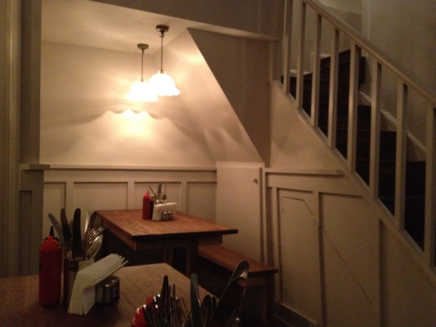 Most of the tables in the basement seat two. The lone table for four is almost literally underneath the stairs.