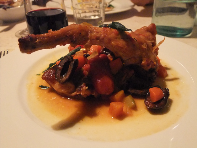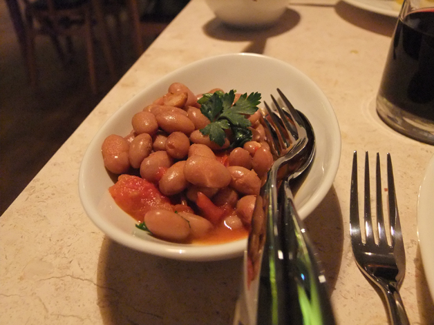 Unfortunately the winning streak started to falter with our main courses. Although my dish of rabbit was very herby with its accompaniment of pine nuts, sage, root vegetables and mildly salty olives, the meat itself varied from tough and dry to excessively soft, losing much of the denseness that distinguishes rabbit. It was at least still quite gamey and you get plenty of bunny for your money. All of the main courses come with your choice of a side dish and although my choice of Borlotti beans in chilli sauce wasn’t spicy in the slightest, the beans themselves were firm and nutty and went surprisingly well with sprigs of parsley.