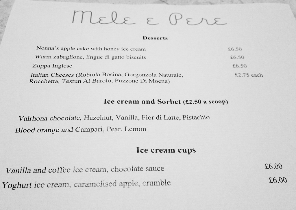 I had high hopes for Mele e Pere. My meal started out well, but the main courses and the desserts were disappointingly average lacking the finesse and sophistication that I had been expecting. Mele e Pere isn’t bad, but it needs to be far better with competition like Bocca di Lupo on its doorstep.