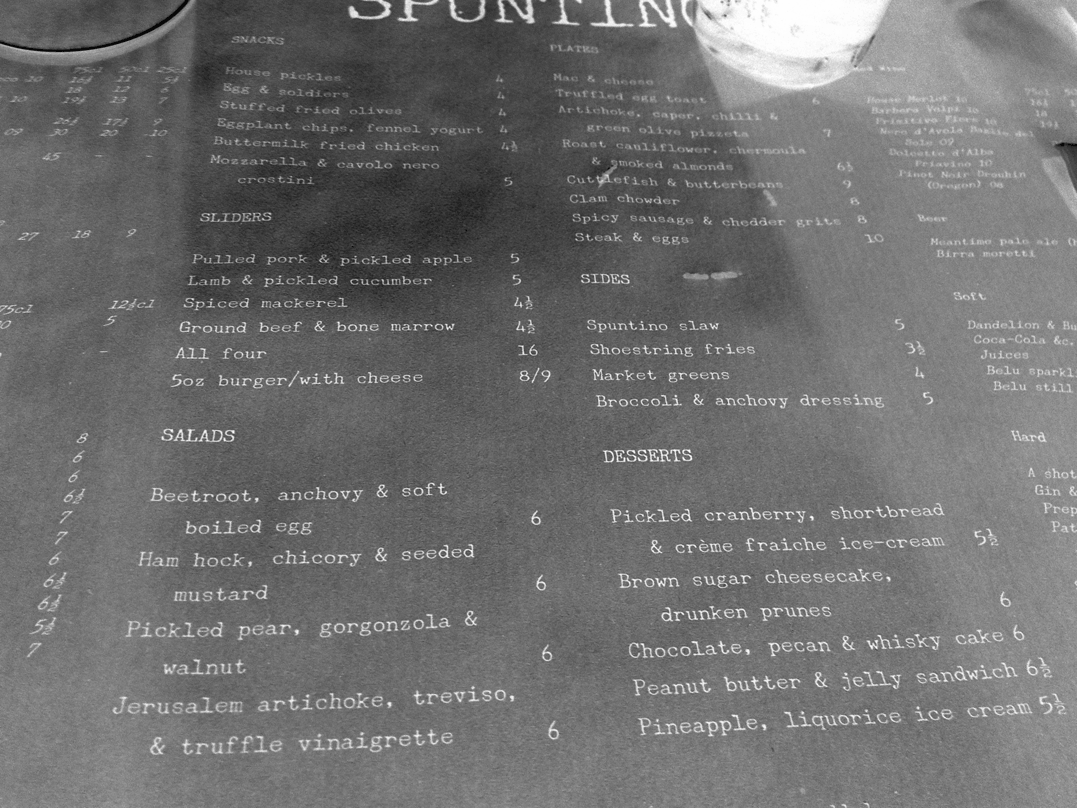 There’s clearly some sterling work going on in the Spuntino kitchen, but this isn’t reflected in all the dishes. For every star like the pulled pork burger or the creme fraiche ice cream, there’s a dud like the lamb and pickled cucumber burger or something interesting but flawed like the PB&J. Although Spuntino is still worth going to, without more consistent quality from the kitchen it’s only really bothering with if you happen to be in Soho and the queue isn’t too long. A heavy hearted three stars.