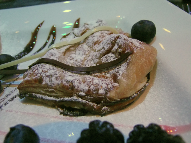Uncharacteristically stuffed, the Hedgie declined dessert but I plumped for the mango strudel. Although described on the menu as a mango pastry accompanied with banana anglaise and vanilla ice cream, this description proved incorrect. The ice cream turned out to be a mango sorbet, while the strudel itself was flavoured with vanilla. Although the sorbet was pleasing if unexceptional, the strudel pastry was tough and chewy and, at best, only mildly flavoured with vanilla. The ‘banana anglaise’ was nothing more than a slice of unmolested banana with several berries for company. Overall, a disappointing and disjointed dessert.