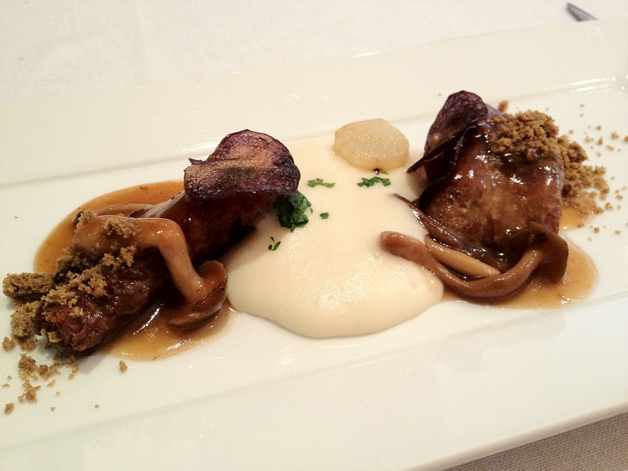 Fusion cuisine has become so clichéd that it’s now something of a joke, but it shouldn’t be when it results in dishes such as Gelonch’s shiitake mushroom and jamon iberico soup. The meaty, earthy, salty soup was like a cross between miso and beef consommé. The plentiful slices of marbled, salty jamon added an extra layer of richness. Just underneath all the ham and silky mushrooms was a lone crab ravioli and I wish there had been more as it was not only stuffed with juicy, meaty crab but had an incredibly evocative salty seaside smell to it. A beautiful dish on so many levels.
