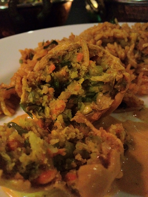 My side dish of vegetable dumplings were served in a nutty and mildly sweet sauce that had a mild and intermittent heat that nonetheless lingered on the tongue. The most notable thing about this dish was the dumplings’ similarity to samosa filling – the fluffy balls of carrot, pea, chickpea and potato were uncannily samosa-like.