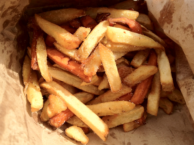 Standard potato fries are available, but more interesting is the mixed portion of potato and sweet potato fries. It’s odd that there isn’t the option to have just sweet potato fries since they are sweet and creamy, but they’re also a little bit too salty and oily for my taste.