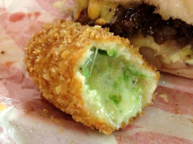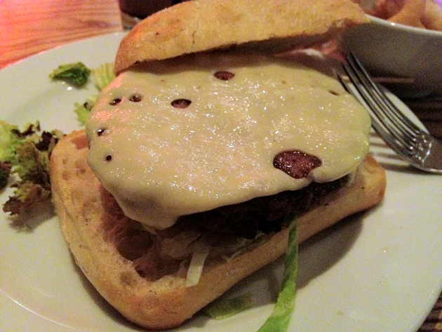 The five ounce patty looks more like bloated meatball, but it compresses nicely when held and doesn’t leak excess meat juices when squeezed. It has a mildly tangy flavour and a chewy edge with a pink core since it’s cooked medium rare. The cheese is nothing to write home about and the bun is stodgy, but the jalapeño peppers and chipolte sauce add a mild, tingly heat that’s very pleasing. The mild spiciness does obscure the taste of the meat to a certain extent, but the overall effect is still pretty tasty.