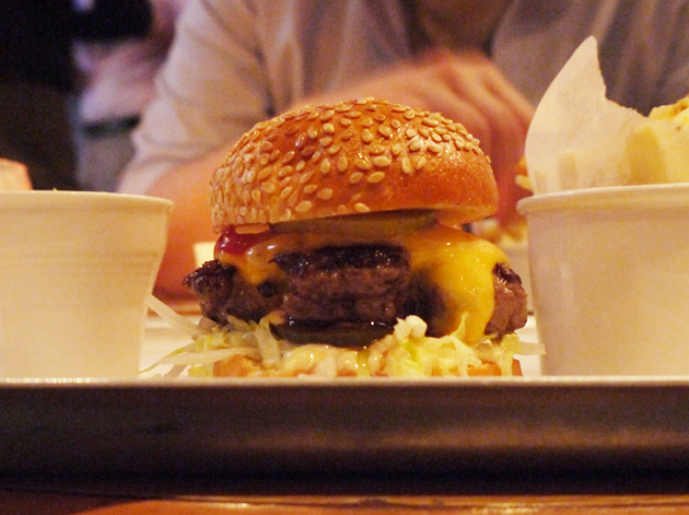 Spuntino serves up a couple of sliders, or mini burgers, but only one uses beef. The ground beef and bone marrow mini patty is ridiculously delicious with a rich, deep layers of tanginess – it’s even better than it was the first time I had it. Pink, tender and seasoned with onions, it really hits the spot. The bun is a smaller version of the stodgy carb fest used in the bigger cheeseburger. I really wish a bigger version of this burger was available – it easily outclasses Spuntino’s main cheeseburger and indeed many of the other burgers here. If Spuntino can maintain this level of meaty goodness, I might just camp at the bar. It’s that good.