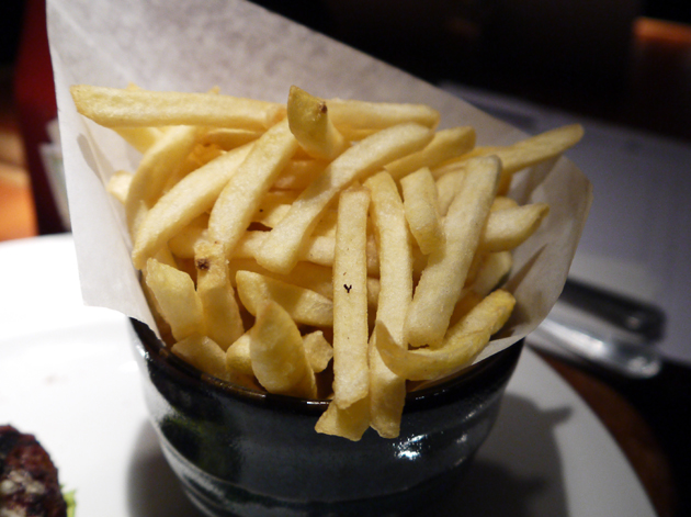 The smoothly ground patty, cooked medium rare, is succulent with a distinctive and addictive nutty tang as well as a slight salty edge while the vegetables add a refreshing touch. The bun not only holds everything together with no spillage, it stays out of the way and doesn’t obscure the taste of the patty. An elegantly superior burger.