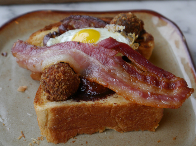 Less successful was the foie gras all day breakfast. The rather flat, tasteless foie gras might as well not be there. Although this is a shame, the dish is still quite tasty without it. Buttery brioche toast is topped with a dark, bitter chocolate spread, runny fried eggs, chewy breaded mushrooms (or at least I think they were mushrooms) and fatty bacon rashers. Although the usual maple cured bacon was off with the kitchen falling back on standard piggy instead, the dish overall is still very pleasing.