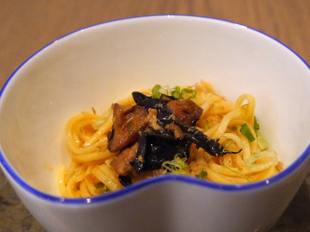 The ‘umami’ noodle dish was surprisingly simple and something of an anticlimax following the inventive flourishes of the tomato trio. Soft egg noodles had been stir fried in chilli oil and topped with salty dried shrimp, earthy slivers of mushroom and crisp spring onions. It’s a safe and homely dish, but it’s a little too simple for its own good given the high prices.