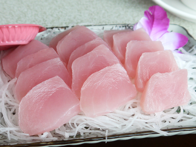 Although the ramshackle decor was rather dilapidated, the fresh, firm tuna-like sashimi was delicious and served with real, nose-burning wasabi – none of the fake horseradish-laden imitation stuff. I’m not sure if the medallion-shaped slices would pass muster with a sashimi chef though and I couldn’t quite place the fish in question. It might be bluefish, but I wouldn’t swear to it.