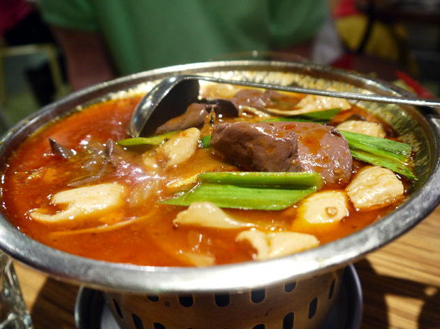 Given the childish squeamishness of everyone else at the table Templeton Peck and I had to divide up the large pot of congealed duck’s blood and tripe between ourselves. The smooth, taut and dimpled tripe tasted just as one would expect, while the chunks of duck’s blood tasted mildly tangy with a smooth surface and a squidgy texture similar to tofu. Both the tripe and blood were served in a moderately spicy broth which barely had any Sichuanese pepper in it.
