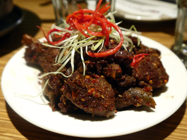 I’m used to eating chicken feet as they’re served steamed in black bean sauce in Dim Sum restaurants. Here they were covered in batter and deep-fried. The dry, garlicky heat wasn’t very strong but was oddly reminiscent of Jamaican jerk chicken or Indian pork coorgi. Not bad, but a rather tame and sedate dish.