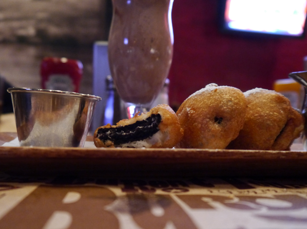 Templeton Peck couldn’t find room for a proper dessert, but my interest was piqued by the deep-fried Oreos, a dish that would no doubt make Elvis’ heart swell with pride and quite possibly cardiac arrhythmia. The slightly crisp, fluffy batter of each slice was essentially identical to that used in the deep fried pickles, but instead of a slice of vegetable at the centre of each one, there was a warm Oreo cookie that had been rendered soft and downy by the heat of the cooking oil.