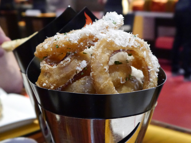 The onion rings were only marginally better. Although whole slices of actual onion are at the centre of each ring, the parched, crunchy, coarse batter is not only bland but it also obscures whatever taste the onions have.