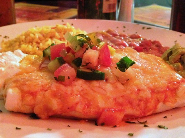 If you wanted to spite yourself and your stomach, then Cafe Mexicali is the place for you. Smothered wet by default, the tortilla breaks apart to reveal some moist but bland chicken served with equally uninteresting bell pepper and onion slices. Served on the side was a portion of mushy but reasonably nutty pinto beans and some smooth, tasteless guacamole. The only way to liven up this dull excuse for a burrito was to slather multiple servings of the ‘hot’ sauce over the burrito until a mild, cumulative spiciness collected on my tongue.