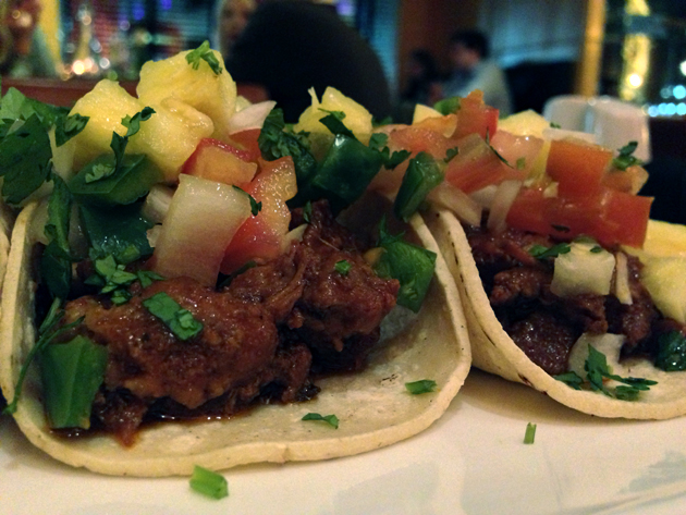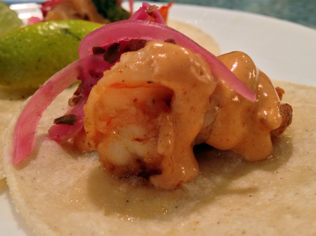 All that ridiculous get-up isn’t as offensive as the prawn and crab tacos. The fill-them-yourself hard shell tortillas were accompanied by shrimp cocktail and some drab crab that was so heavily refrigerated, it might as well have been shredded fish sticks.