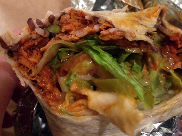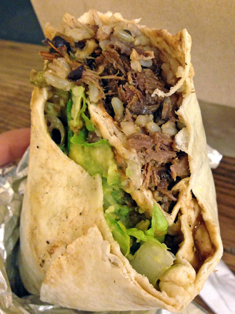 Although the pork was reasonably firm and mildly peppery, it was a bit too dry and rather bland overall. The tingly heat of the spicy sauce and the saltiness of the firm black beans was counterbalanced nicely by the fresh, sweet tomatoes and coriander. Although a bit too smooth, the guacamole was sweet, zesty and creamy. The rice looked more like quinoa and outnumbered the meat. There was some leakage of hot sauce due to the slapdash wrapping, but it wasn’t too bad.