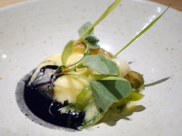 Potatoes usually form the basis of a side dish rather than a course in of themselves. Here, a firm hemisphere of potato was served alongside a creamy soft mash that had an acidic flavour due to the addition of radish. A few sprigs of barley grass added an extra layer of moreishness, although the oddly neutral black oil was a strange addition. It all sounds very odd, but it’s just flavoursome and interesting enough to work as a tasting course in of itself.