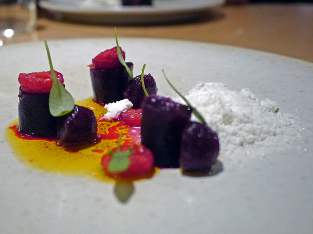 Beetroot, raspberry and horseradish sounds like a random selection of words thrown onto a page rather than a dish, but this odd combination of ingredients worked surprisingly well. The earthy taste of the small cylindrical pieces of beetroot were complimented nicely by the sweetness of the raspberries, with the horseradish acting as a spicy palate cleanser. The horseradish takes the unusual form of small, icy, crumbly blocks. Somehow infusing the typical horseradish heat into a crumbly form with a very atypical icy cold finish emphasised the spice of the horseradish rather then detracting from it. Splendid.