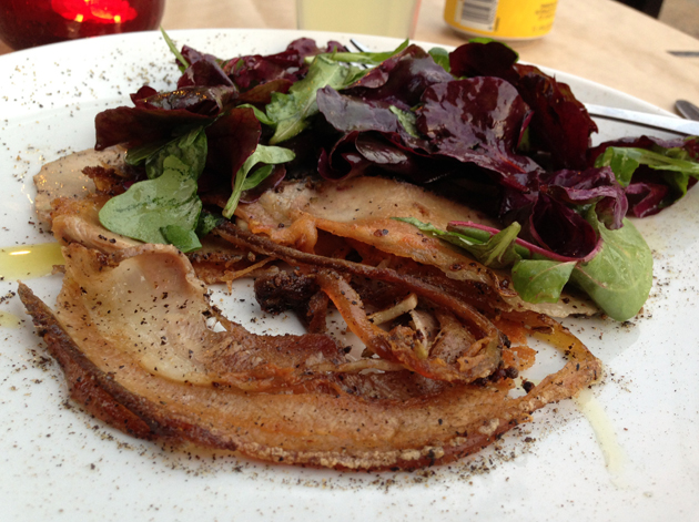 Osteria Tufo is one of the few Italian restaurants in London I know of that serves porchetta. This Italian roast pork dish is, at its best, ridiculously addictive. The version here consisted of crisp slices of back bacon with a sweet, caramelised edge and hints of rosemary. The herby porkiness went very well with the earthy leaves dressed lightly in vinegar. It’s a good version of porchetta and it could easily be a main dish in its own right if other, different cuts of pork were included in the mix along with some crackling.