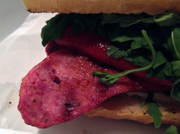 The chorizo used in the chorizo baguette was mildly corase and surprisingly lean. I’m pretty sure it was made out of beef rather than pork which, combined with its lack of fat, made it resemble a mild Turkish sucuk more than the chorizo I’m familiar with. It wasn’t bad, especially when taken in combination with the same sweet roasted peppers and rocket as used in the steak ciabatta, but it wasn’t as satisfying as that sandwich.