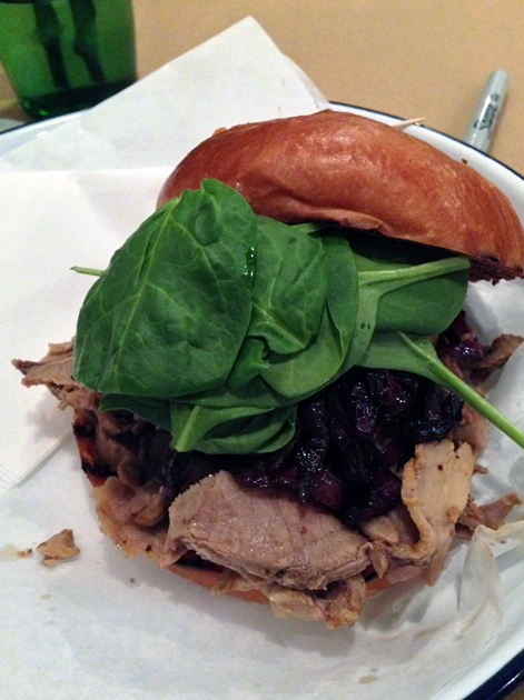 Surprisingly, the veggie option turned out to be far better than either the chorizo or pork sandwiches. A buttery brioche bun was filled with a large meaty portobello mushroom, but the real stars were the strong garlicky chimichurri sauce and the tang of goat’s cheese which melded together to form a tart, punchy, flavoursome combination.