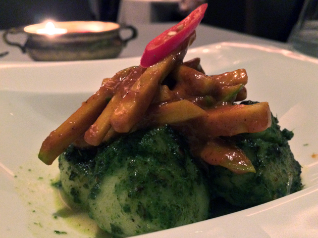 A good accompaniment to the rabbit was the vegetable dumplings. This trio of soft, slightly doughy dumplings dotted with tenderised cashews was served in a sauce that was creamy, but not excessively so. My sauces got mixed up at some point during the meal, so I’m not sure if it was the rabbit or the dumpling sauce that had a mild, but piercingly palate cleansing freshness to it.