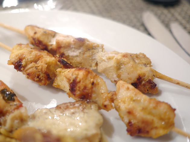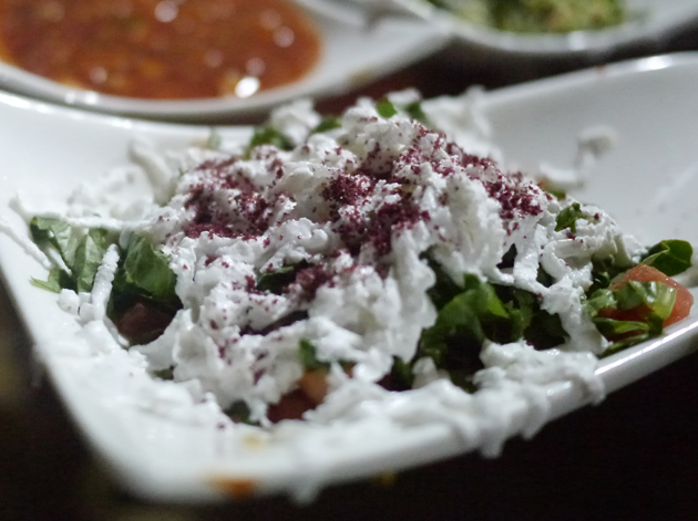 The chopped parsley and tabbouleh salad left me cold, but the salad topped with light, fluffy and salty goat’s cheese was a winner as was the surprisingly spicy salsa-like concoction.