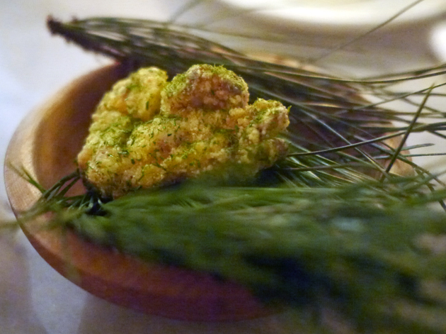 The meat-based amuse bouche started off with a moist and meaty chunk of fried chicken coated in a crisp, light, herby and oil-free batter that was a marvel to behold and eat.