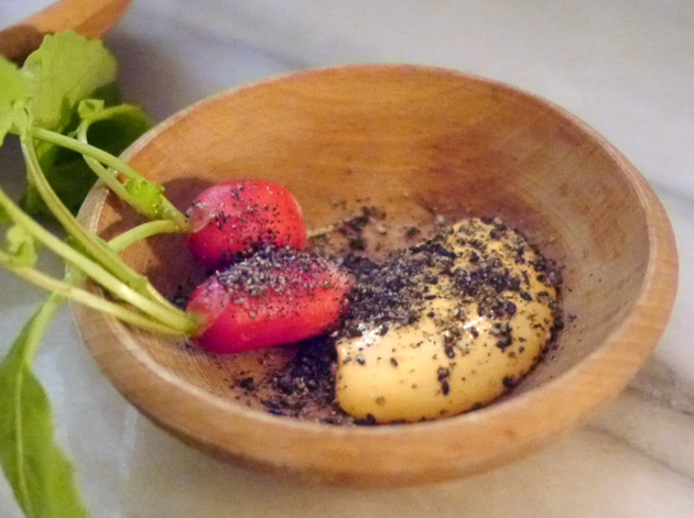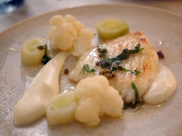 The cod cream was served on an odd cracker that resembled an enlarged bran flake, but that didn’t detract from the delicate yet unctuous texture of the cream or its distinctively salty fishiness.