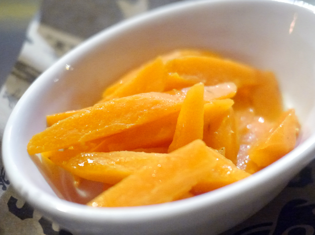The baby back ribs came coated in a spicy, tangy sauce that stuck to the tender pig meat rather than to my fingers. The tangy heat was pleasing, but they were also a touch on the dry side and weren’t smoky at all.
