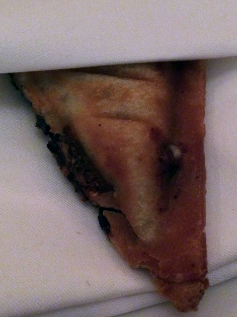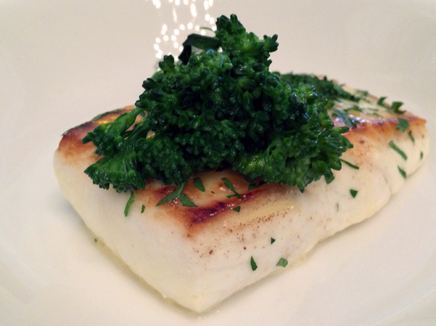 Snails plucked out of their shells, a well as a smudge of black pudding, were served in surprisingly generous serving of potato and parsley soup. The parsley unsurprisingly dominated the taste of the moderately thick and very creamy soup, but the overall effect was of a sweet and moreish pea soup. Unlike other snails I’ve had in the past, which were earthy and chewy, these ones were tender and buttery. They were nonetheless exceedingly moreish, especially when taken with a mouthful of soup. The snail-to-soup ratio may seem a little out of kilter and stingy, but this was more than compensated for by the fluffy triangular piece of toast filled with an earthy mushroom-like filling. Although I couldn’t really use it to mop up the soup, it was so addictive and complimented the taste of the snails so perfectly that I didn’t really care.
