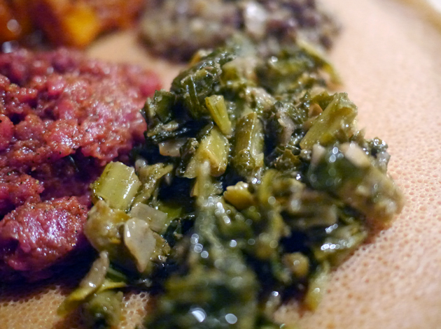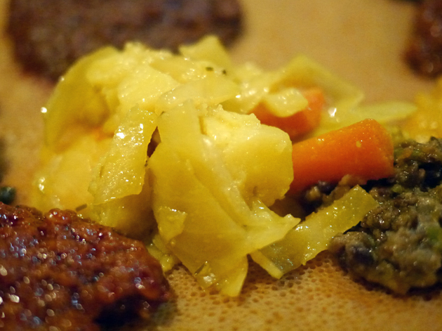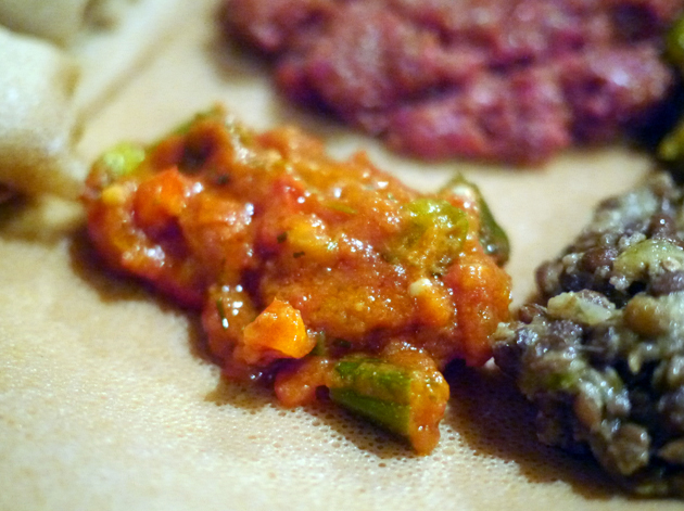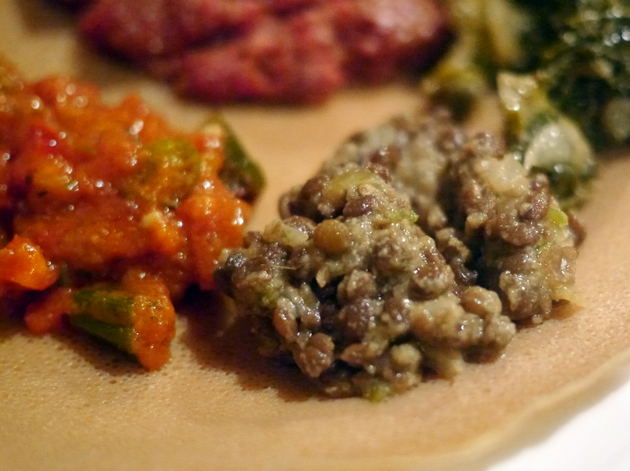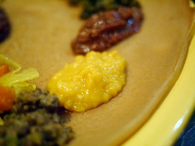 I returned to Lalibela on a weekday night with the help of The Lensman, Veal Smasher, Porn Master and Happy Buddha. Between the five of us, we managed to order a staggering amount of food – just thinking about it is enough to make me full. The Lensman and Happy Buddha got the ball rolling with the Ye-stom Beyaynetu, a combination of lentils and split peas in a spicy sauce. Although the sauce’s heat was tepid at best, the tender, moreish lentils and the salty peas went down a treat. Of all the accompanying sides, the one that stood out the most was the coarse, fluffy, nutty puree of chick peas – basically hummus.